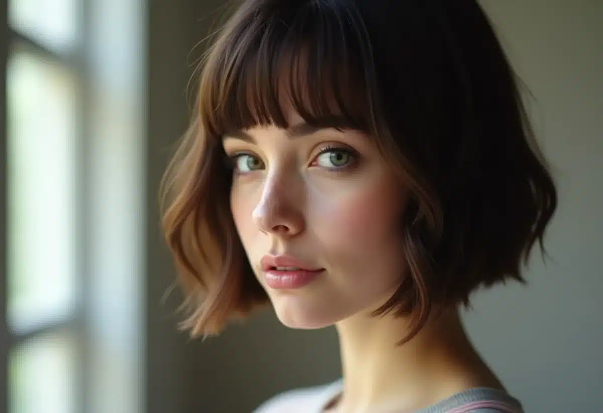 • La frange droite : elle accentue les proportions équilibrées et ajoute une dimension contemporaine à la coiffure.